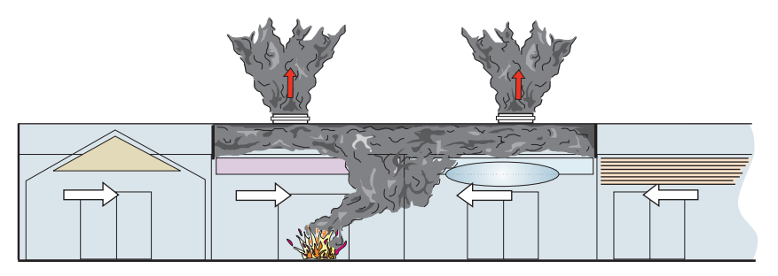 当建筑物内发生火灾的时候,炙热的烟雾会迅速上升,堆积在天花板周围。在没有阻隔的情况下,烟雾会沿着天花板快速扩散到整个建筑物内部,形成烟雾层。